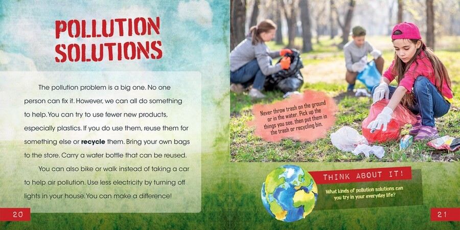 Pollution is one of the leading causes of habitat destruction. Air pollution, water pollution, and land pollution make many habitats unsafe and inhospitable for their native plants and animals. This book explores the pollution problem in an age-appropriate way, with fascinating facts and opportunities for critical thinking. Faced with photographs of pollution, readers will come to understand the far-reaching threat of this issue. Readers will also learn how to take steps to clean up their community—and Earth!